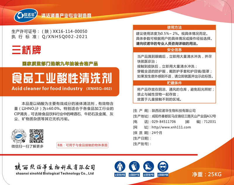 2.三橋牌食品工業(yè)酸性清洗劑(XNHHSQ-2型)從原材料到包裝及整個生產(chǎn)過程均采用食品級標(biāo)準(zhǔn)生產(chǎn),安全無毒性,對塑料、不銹鋼無腐蝕,對橡膠密封件相對溫和。
