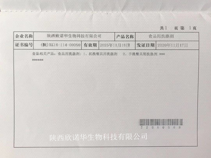 經(jīng)過公司上下齊心努力下,經(jīng)過半年的準(zhǔn)備,近日,順利通過陜西省市場監(jiān)督管理局的各項審核,成功取得了《全國工業(yè)產(chǎn)品生產(chǎn)許可證》,獲得食品用洗滌劑(手洗餐具洗滌劑,機(jī)洗餐具洗滌劑)生產(chǎn)資格,符合產(chǎn)品生產(chǎn)許可條件。陜西欣諾華生物科技有限公司成為同時具有機(jī)洗餐具洗滌劑B類,手洗餐具洗滌劑A類兩大類產(chǎn)品生產(chǎn)許可的企業(yè)。