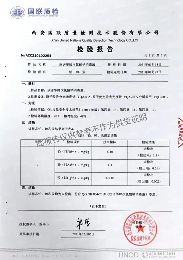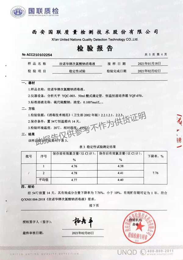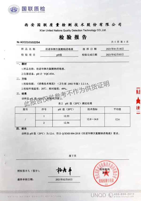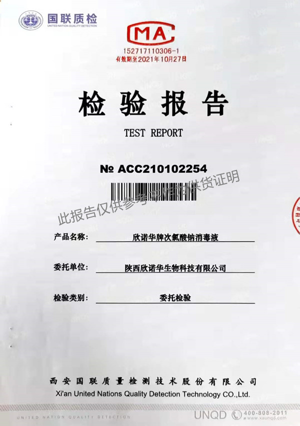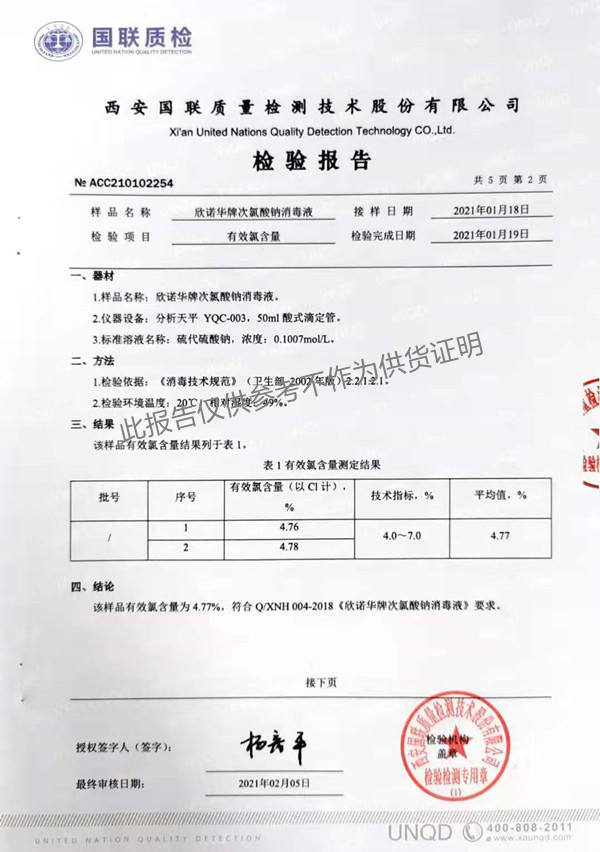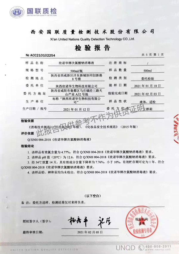 欣諾華牌次氯酸鈉消毒液(XNH004型)檢測(cè)報(bào)告(2021年度)-陜西欣諾華生物科技有限公司