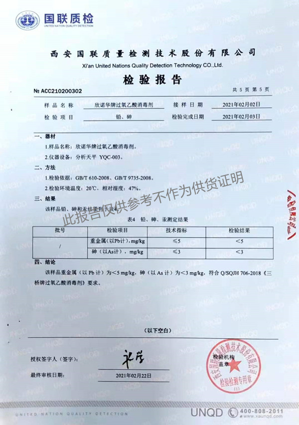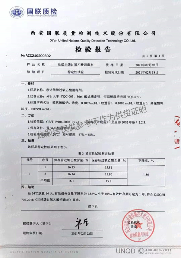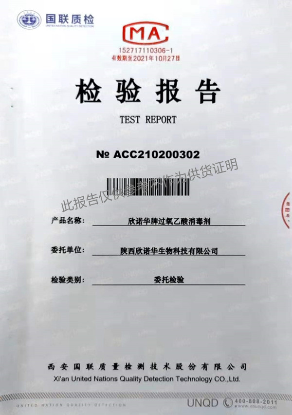 欣諾華牌過(guò)氧乙酸消毒劑(SQ-706型)檢測(cè)報(bào)告(2021年度)-陜西欣諾華生物科技有限公司