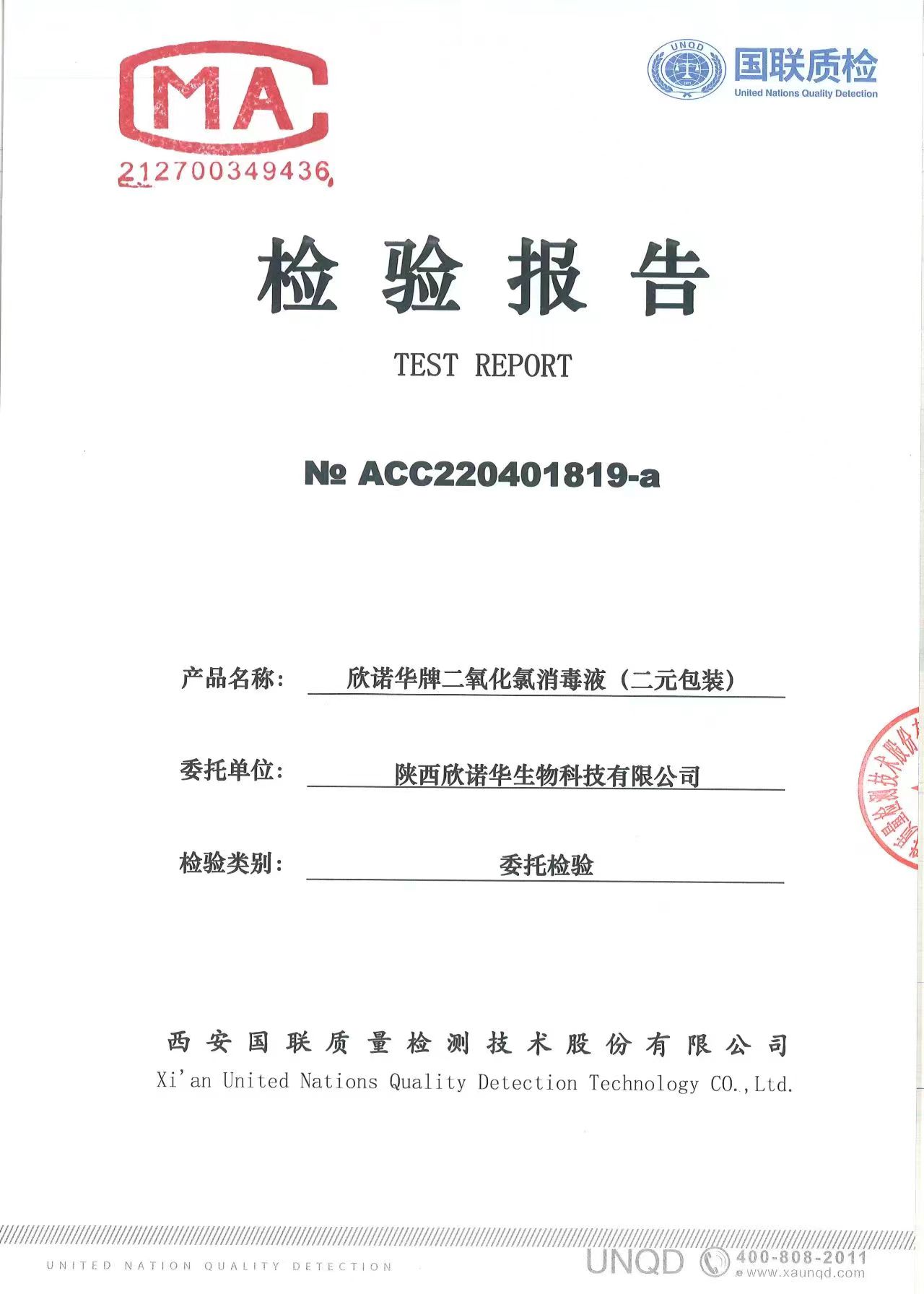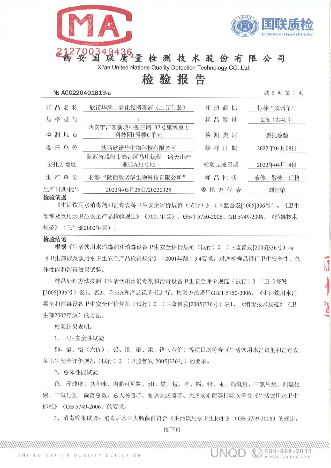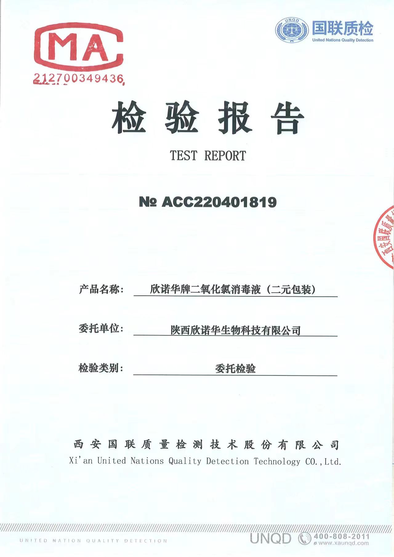 二氧化氯消毒液(商品名稱:欣諾華牌二氧化氯消毒液)第三方檢測報(bào)告,本品是以二氧化氯為主要有效成分的消毒液,主要用于生活飲用水消毒,二次供水消毒。含量:2.0%,生產(chǎn)商;陜西欣諾華生物科技有限公司,服務(wù)熱線:13991111706(微信同號)
