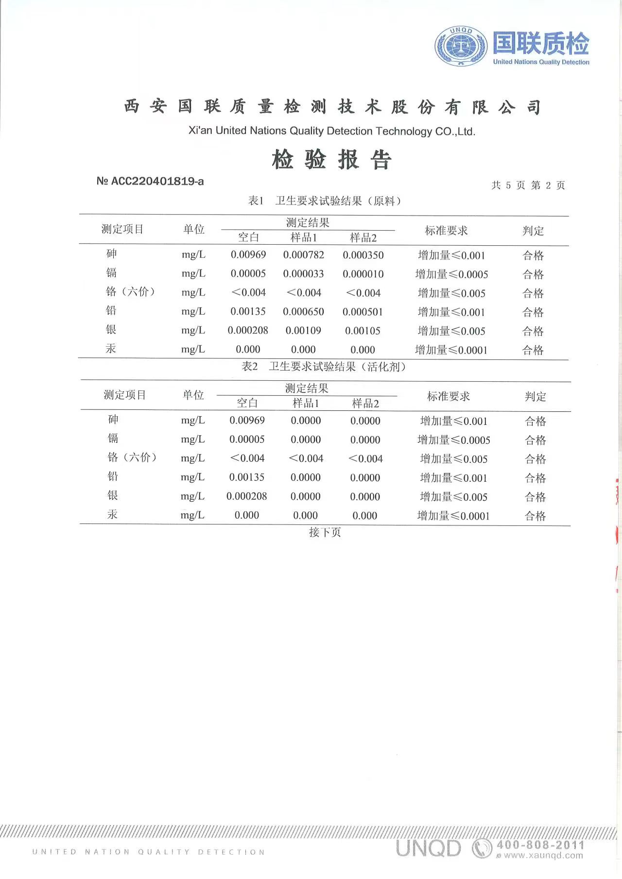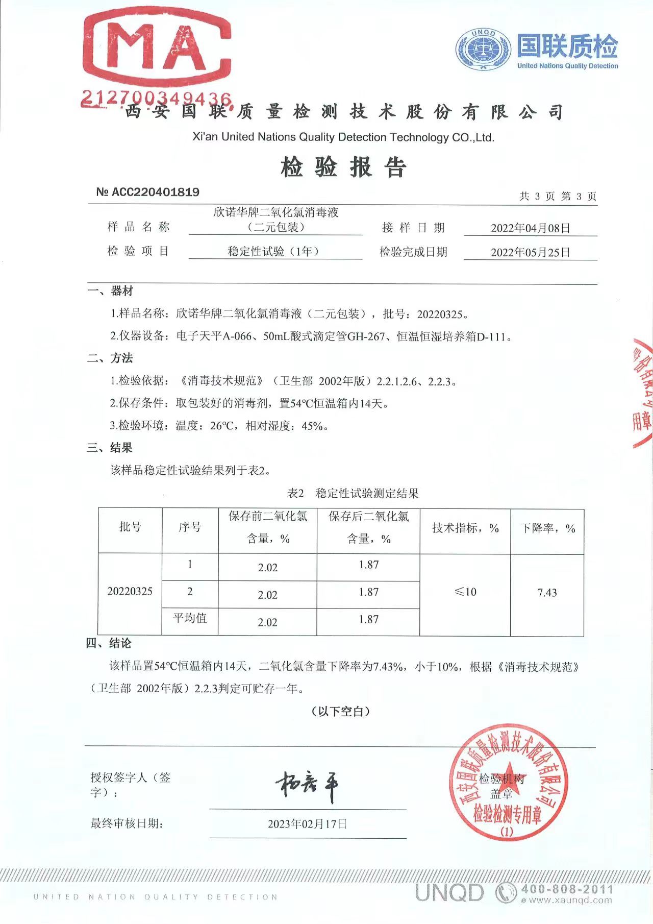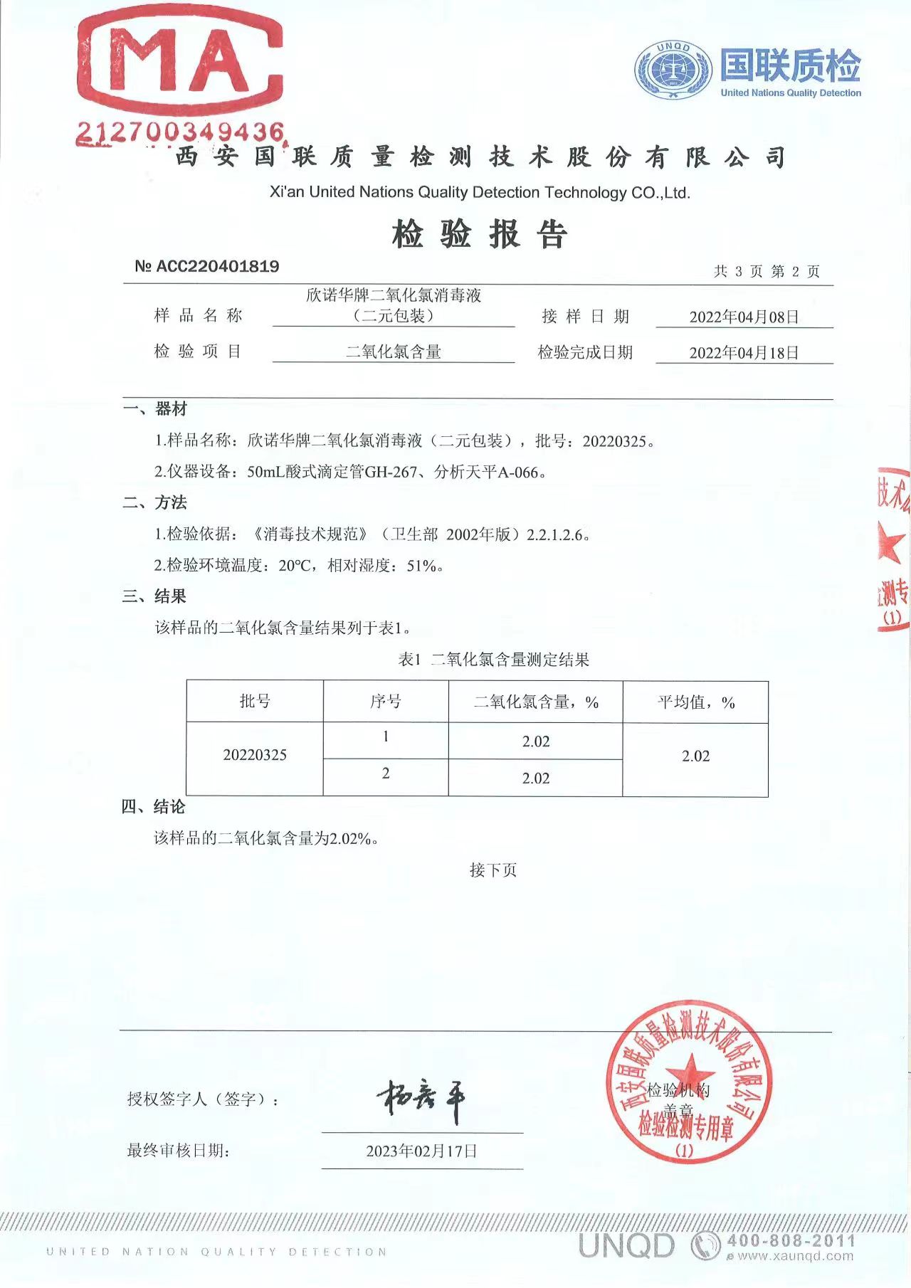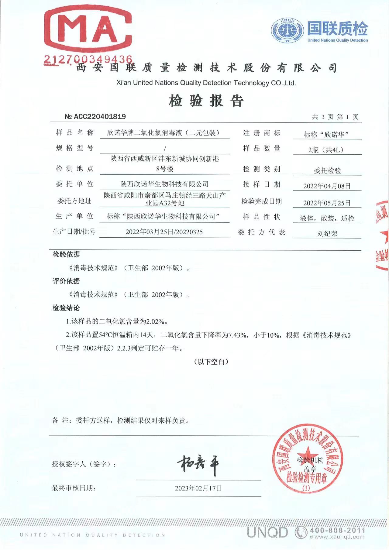 二氧化氯消毒液(商品名稱:欣諾華牌二氧化氯消毒液)第三方檢測報(bào)告,本品是以二氧化氯為主要有效成分的消毒液,主要用于生活飲用水消毒,二次供水消毒。含量:2.0%,生產(chǎn)商;陜西欣諾華生物科技有限公司,服務(wù)熱線:13991111706(微信同號)