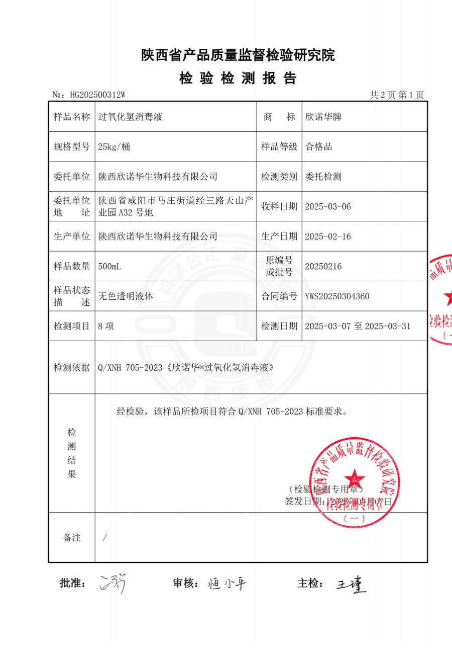 欣諾華牌過氧化氫消毒液(食品級雙氧水)檢測報告(2024年度)-陜西欣諾華生物科技有限公司
